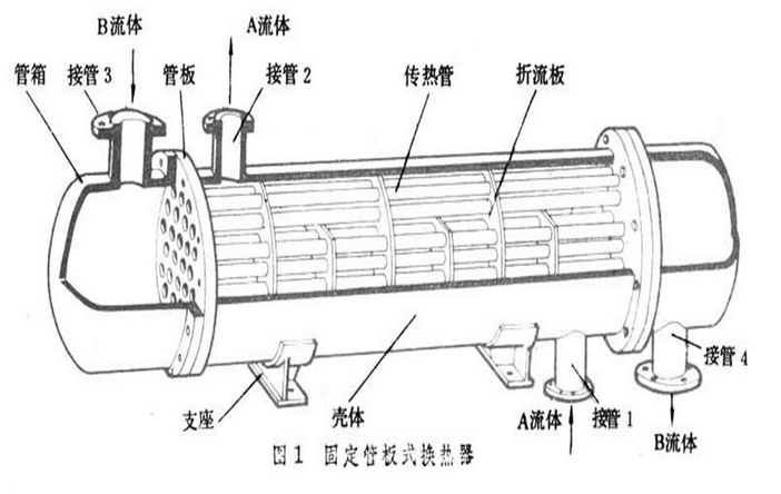 圖1[固定管板式換熱器]為固定管板式換熱器的構造。A流體從接管1流入殼體內,通過管間從接管2流出。B流體從接管3流入,通過管內從接管4流出。如果A流體的溫度高于B流體,熱量便通過管壁由A流體傳遞給B流體;反之,則通過管壁由B流體傳遞給A流體。殼體以內、管子和管箱以外的區(qū)域稱為殼程,通過殼程的流體稱為殼程流體(A流體)。管子和管箱以內的區(qū)域稱為管程,通過管程的流體稱為管程流體(B流體)。管殼式換熱器主要由管箱、管板、管子、殼體和折流板等構成。通常殼體為圓筒形;管子為直管或U形管。為提高換熱器的傳熱效能,也可采用螺紋管、翅片管等。管子的布置有等邊三角形、正方形、正方形斜轉45°和同心圓形等多種形式,前3種最為常見。按三角形布置時,在相同直徑的殼體內可排列較多的管子,以增加傳熱面積,但管間難以用機械方法清洗,流體阻力也較大。管板和管子的總體稱為管束。管子端部與管板的連接有焊接和脹接兩種。在管束中橫向設置一些折流板,引導殼程流體多次改變流動方向,有效地沖刷管子,以提高傳熱效能,同時對管子起支承作用。折流板的形狀有弓形、圓形和矩形等。為減小殼程和管程流體的流通截面、加快流速,以提高傳熱效能,可在管箱和殼體內縱向設置分程隔板,將殼程分為2程和將管程分為2程、4程、6程和8程等。管殼式換熱器的傳熱系數(shù),在水-水換熱時為1400~2850瓦每平方米每攝氏度〔W/(m(℃)〕;用水冷卻氣體時,為10~280W/(m(℃);用水冷凝水蒸汽時,為570~4000W/(m(℃)。