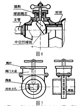 這種可調(diào)節(jié)散熱器的關(guān)鍵部位是三通閥部分(或調(diào)節(jié)閥部分)。將散熱器的上部改造為一個(gè)三通閥 ,下部作“跨越管” 。如, 可以采用這樣一種做法,將第一與第二片散熱器之間的對絲的一端加工成中空的環(huán)形凹球面, 而將閥桿下部的閥芯加工成斜放的半球 ,旋轉(zhuǎn)閥芯實(shí)現(xiàn)對絲中孔開度大小的變化 ,進(jìn)而實(shí)現(xiàn)熱水流量的調(diào)節(jié)(如圖 6)。當(dāng)然, 閥的結(jié)構(gòu)可以是與此不同的其它形式。
