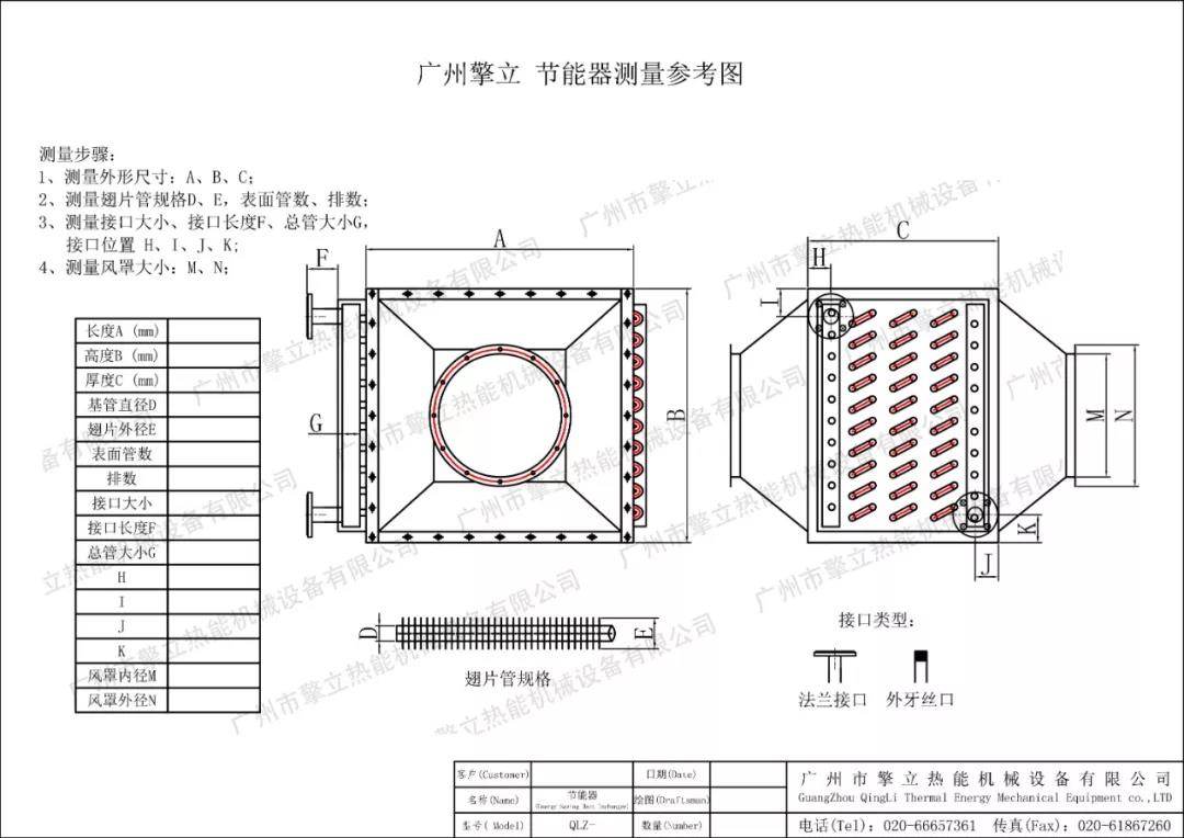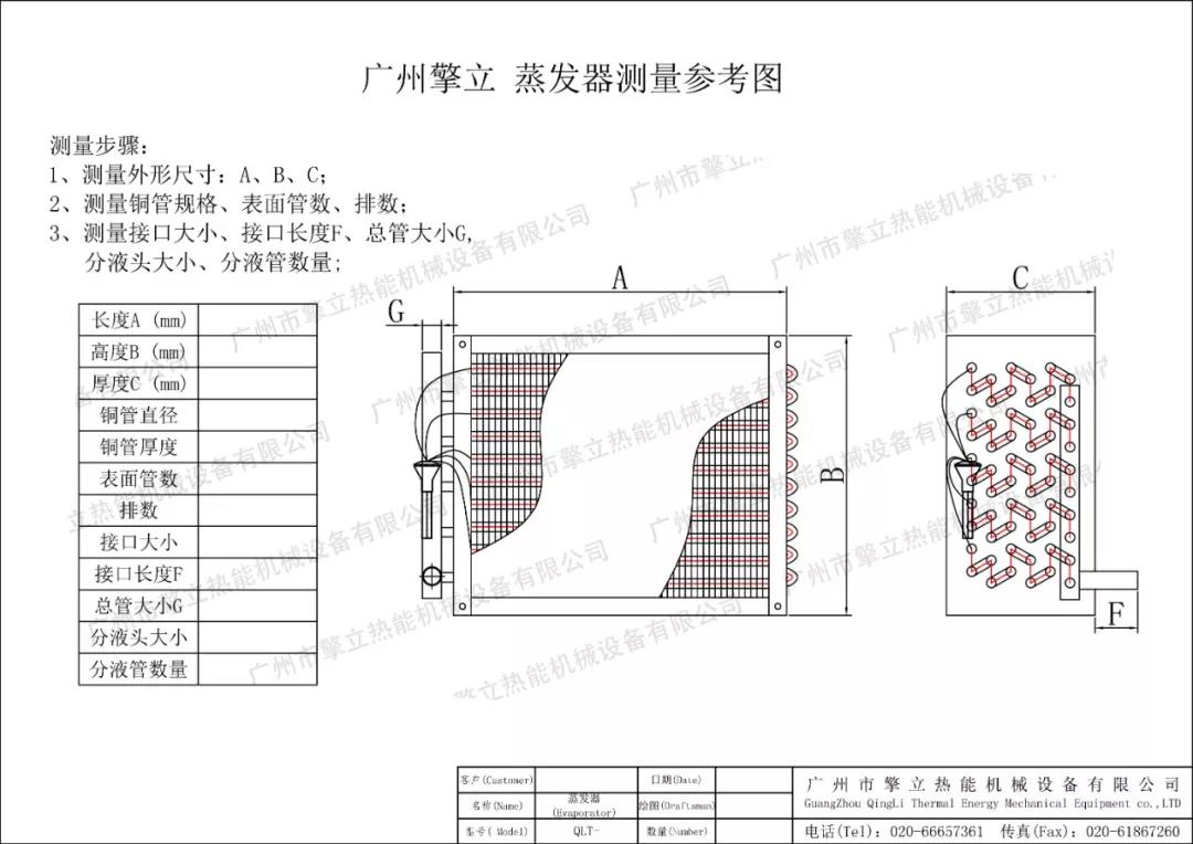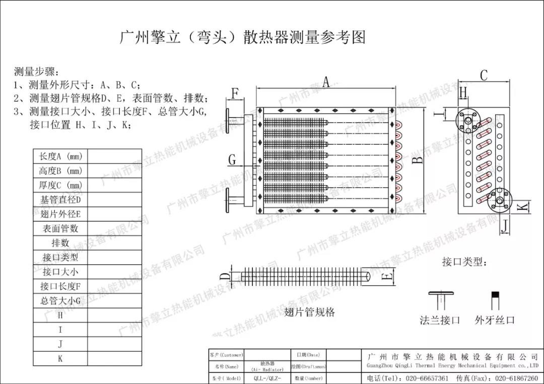 測(cè)量圖包含了長(zhǎng)高厚位置示意,基管直徑、翅片外徑、表面管數(shù)、排數(shù)、接口類(lèi)型大小,接口中心距,長(zhǎng)度等~需要安裝孔位的還需要測(cè)量安裝孔位的大小,中心距等~